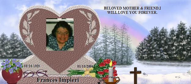 Mom your passing was way too soon. Not a minute goes by that you are not in my thoughts. You were the BEST Mother and friend anyone could have ever dreamed of. It is almost 4 years now that you are gone and the void in my life is wider than ever. Your love and devotion to me and Anthony are beyond words. You were selfless in your caring and kindness, not only to us, but to all who knew you and even those who did not have the honor and pleasure of having you in their lives. You touched so many people with your kind and caring ways. You were truly an Angel on earth. I feel you around me every day and know you are my Angel. When you were diagnosed with cancer, you were always positive. You always had a smile and a caring word to say to all who came in contact with you. You never once complained. Not once. Your faith far surpassed anything I could ever comprehend. You always told me that when your time came you would be happy because you would be going home to God and that we should not be sad but be happy. My only regret is that I was not there to say good bye when you crossed over. I know you are happy and free from the pain and suffering where you are now. Please know you will be in my heart forever and I am looking forward to the day we can be together again. Tell Granny, Baba, Uncle and Aunt Jo we say hello and miss them everyday. There must be a great party going on up there with all of you togther again. I love you Mommy with all my heart. 6/26/2007 Hi Mommy. Uncle Dick isn't well Mom. He has leukemia and the doctors say it's not good and can get worse. Auntie Anne is putting up a good front but she is worried. Uncle Dick is keeping a positive attitude which is a good thing. I'm asking you to please watch over him. Send some of your love and prayers down to him to make this a little easier on the both of them. We are hoping he will go into remission. All I can do is hope and pray he will come through this. He loved you very much and when I saw them in March they talked about you non stop. Auntie Anne and Uncle Dick miss you something awful. If anyone can get him through this I know you can. I miss you so much Mom. I will love you FOREVER. 8/15/07 Hi Mommy. Uncle Dick is with you now. He passed away today. Auntie Ann is being really strong but I know it was hard for her. At least he is with you all now and free of pain and suffering. Take good care of him. I know he must have been so happy to see you all again. I love and miss you Mom. 12/25/07 Merry Christmas Mommy. Not a day goes by that I do not think of you. Sometimes I even can feel you around me. The holidays are not what they used to be without you but I know you are in a much better place. Love you ALWAYS....Carol 1/1/08- Happy New Year in heaven Mom. Just wanted to stop by and say hello and I love you. Love, Carol 1/10/08 - Hi Mommy. Today is 4 years since you left us. I wish I had one more day with you so I could see your smile, hear your laugh, and feel your loving touch that only you could give. You were the best Mother anyone could ever dream of having and I miss you dearly. As much as I miss you. I know you are where you want to be. It's your time to fly high and free with the angels. Love ALWAYS and FOREVER....Carol "Perhaps they are not stars Eskimo Legend 3/15/2008 - Hi Mommy. I miss you so much Mom. They say it gets better as time passes. Well I guess whoever said that didn't have a Mom like you. The older I get,the longer you're gone, the more I miss you Mommy. Love Always and Forever - Carol 5/11/2008 Happy Mother's Day in Heaven Mommy. I used to love this day but now, it's not one that I look forward to anymore. It just gets harder and harder the longer you are gone. I miss you something awful. I hope you are having a great day today with Granny. Thinking of you Always.....Love and miss you Mom. Hugs and kisses forever. Love Carol 5/26/2008 Happty Birthday Mommy. I think of you every minute of every day. I miss you so much. Be happy Mommy. Love Always - Carol 7/2/2008 - Mommy I just found out that Roe is with you now. What a shock. I can't belive this has happened. I was so happy that we recently had re-connected and then I got a call from Annie. I am so sad. I know she was so happy to see you as she alsways talked about you every time we spoke. I know you are taking care of her up in heaven now. I love you more than anyone will ever know. Love Always - Carol 11/2/2008 - Aunt Mary is with you now. I hope all is well up there. Loving and Missing you. Love, Carol 11/27/2008 - Happy Thanksgiving in heaven Mom. I know you are all together looking down on us. I am thankful I had such a loving Mother. Love you Mommy. Love Carol 12/25/2008 - Merry Christmas Mom. I love you. Love, Carol 1/1/2009 - Happy New year Mom. Can't believe it will be 5 years soon that you are gone. I hope you are flying high on your Angel wings. You must have the biggest pair of wings up there. You were my Angel on earth and now my Angel in heaven. Love you Mommy. Love, Carol 1/10/2009 - Mommy, today is 5 years since you left us. I wish I could turn back the hands of time so I could see you one more time. I miss you so much. Love, Carol 1/10/10 Mommy it's 6 years you are away from us. It seems like forever. I miss you and love you. Love, Carol 1/10/11 Happy 7 th anniversary in heaven Mommy. I love you so much. Love, Carol 7/16/15 11 1/2 years. How I miss you so my Beloved Mother. It doesn't get easier. The hardest thing I have ever had to do is live without you. |